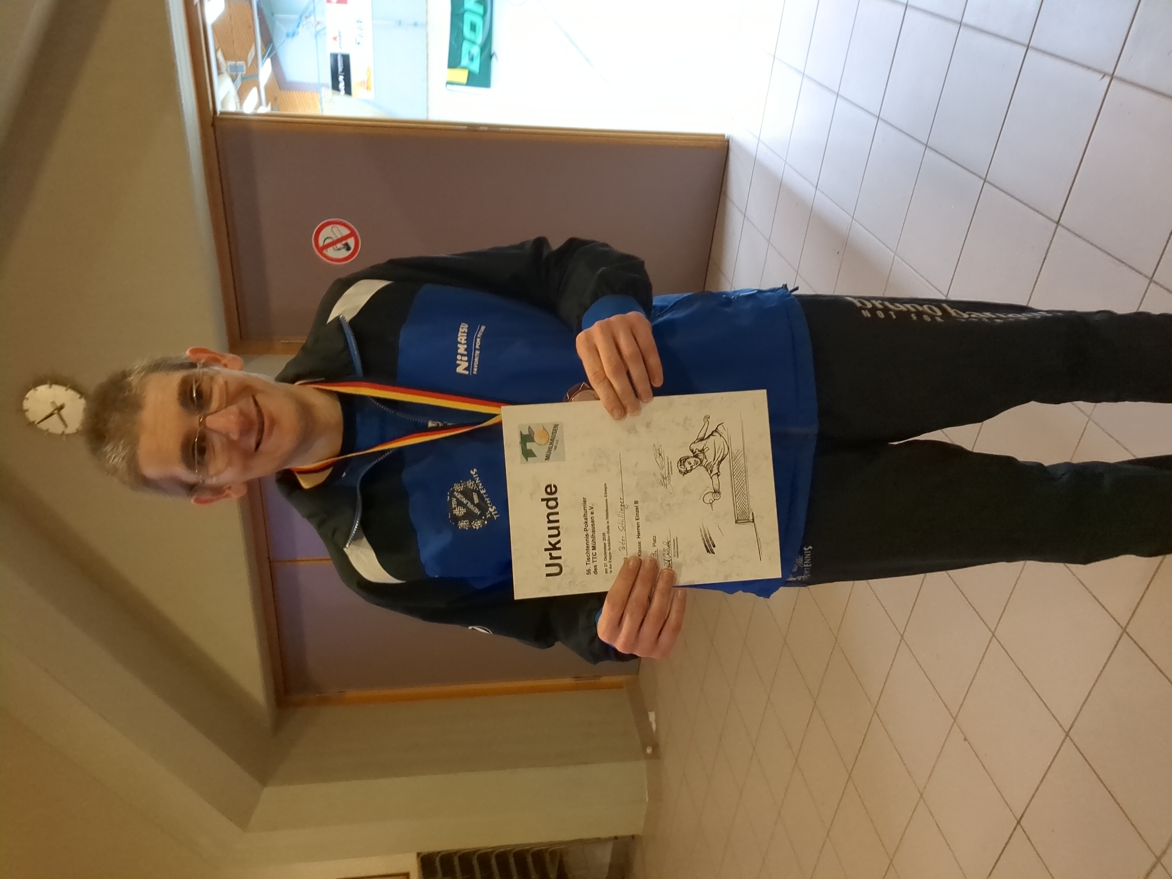 Der Erwachsenen D-Wettbewerb, der bis zu einem QTTR-Wert von 1.350 Punkten ausgeschrieben war, war dabei komplett in Ulmer Hand. Alexandra Schillinger, die in dieser Konkurrenz nur aufgrund der ausgefallenen Damenklasse antrat, und Andreas Pfaff harmonierten hier zunächst im Doppel hervorragend und konnten doch recht unerwartet das oberste Treppchen des Siegerpodests erklimmen. Doch dies sollte nicht ihr einziger Coup bleiben. Im Einzel ließen sie nämlich ebenfalls das gesamte Feld hinter sich. Alexandra, die sich nach ihrer Niederlage im ersten Vorrundenspiel am frühen Morgen erheblich steigern konnte, setzte sich schließlich im Finale in drei Sätzen gegen ihren Doppelpartner Andreas, der sich aber trotzdem wie sie über den hervorragend gelaufenen Turniertag inklusive Pokal- und Medaillengewinn riesig freute, durch. Auch Peter Schillinger musste die Heimreise nicht ohne Erfolgserlebnisse antreten. Er belegte nach zahlreichen intensiven Duellen und relativ knappen Niederlagen im Endspiel bzw. im Halbfinale bei den Senioren 50 den zweiten und im Erwachsenen B-Wettbewerb (QTTR-Wert maximal 1.700 Punkte) den dritten Platz. Mitten in der Nacht, nachdem man etwa 18 Stunden in der Halle verbracht hatte, wurde die lange Rückfahrt bei teilweise sehr dichtem Nebel letztendlich ebenso noch erfolgreich gemeistert.