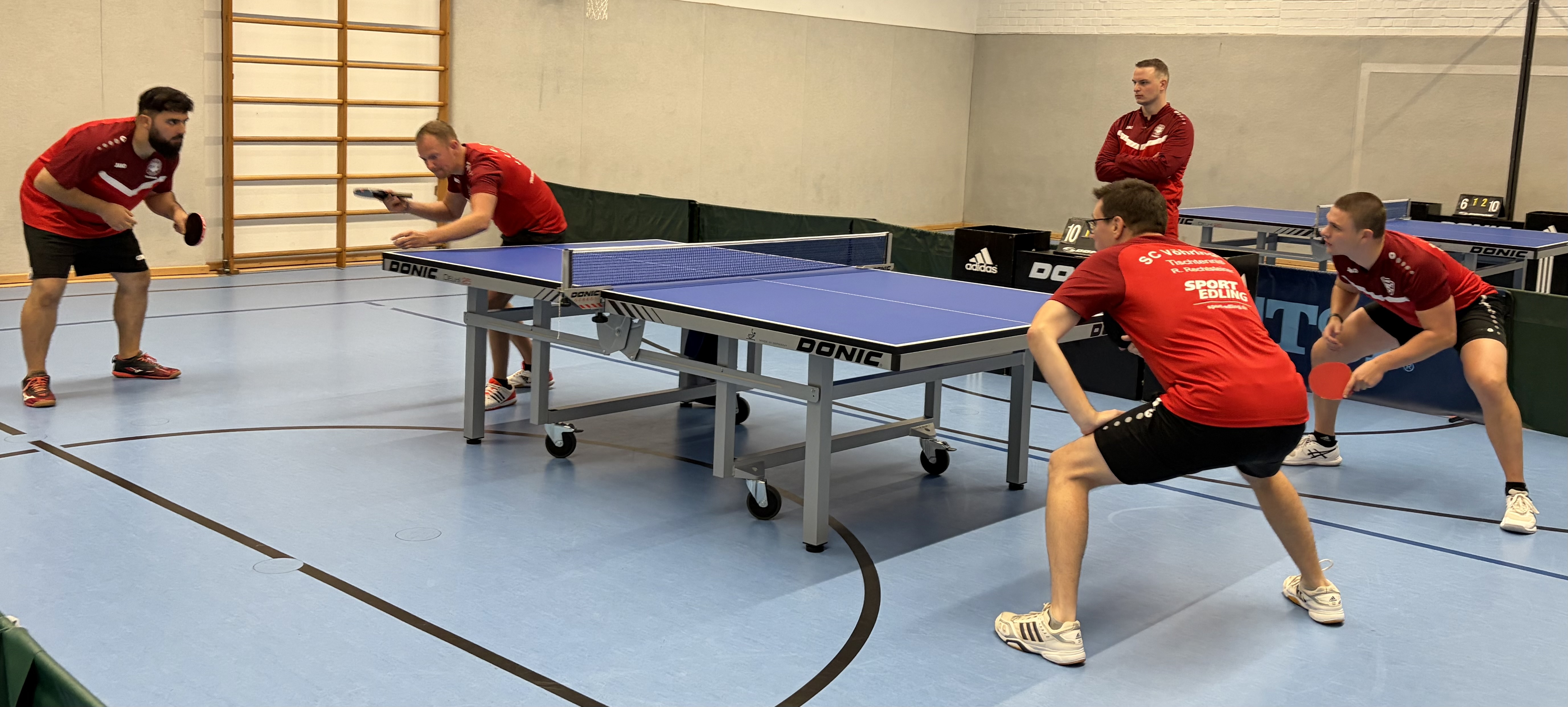 Im Schlussdoppel (siehe Bild) hatte das Erbacher Duo auf der linken Seite (beide Teams haben die identischen Trikots, immerhin blieben so alle Zuschauer/Teamkollegen/Tischschiedsrichter etc. schön aufmerksam) dann zwar keine Mühe, ein gut aufgelegter Erik Meier steuerte da aber schon zwischenzeitlich den 8. Punkt und somit das sichere Unentschieden für den ohne Marc Kukofka angetretenen leichten Außenseiter Vöhringen bei. Mit dem Unentschieden können sicher beide leben, zumal auch die Sätze mit 31:31 nicht ausgeglichener hätten sein können.