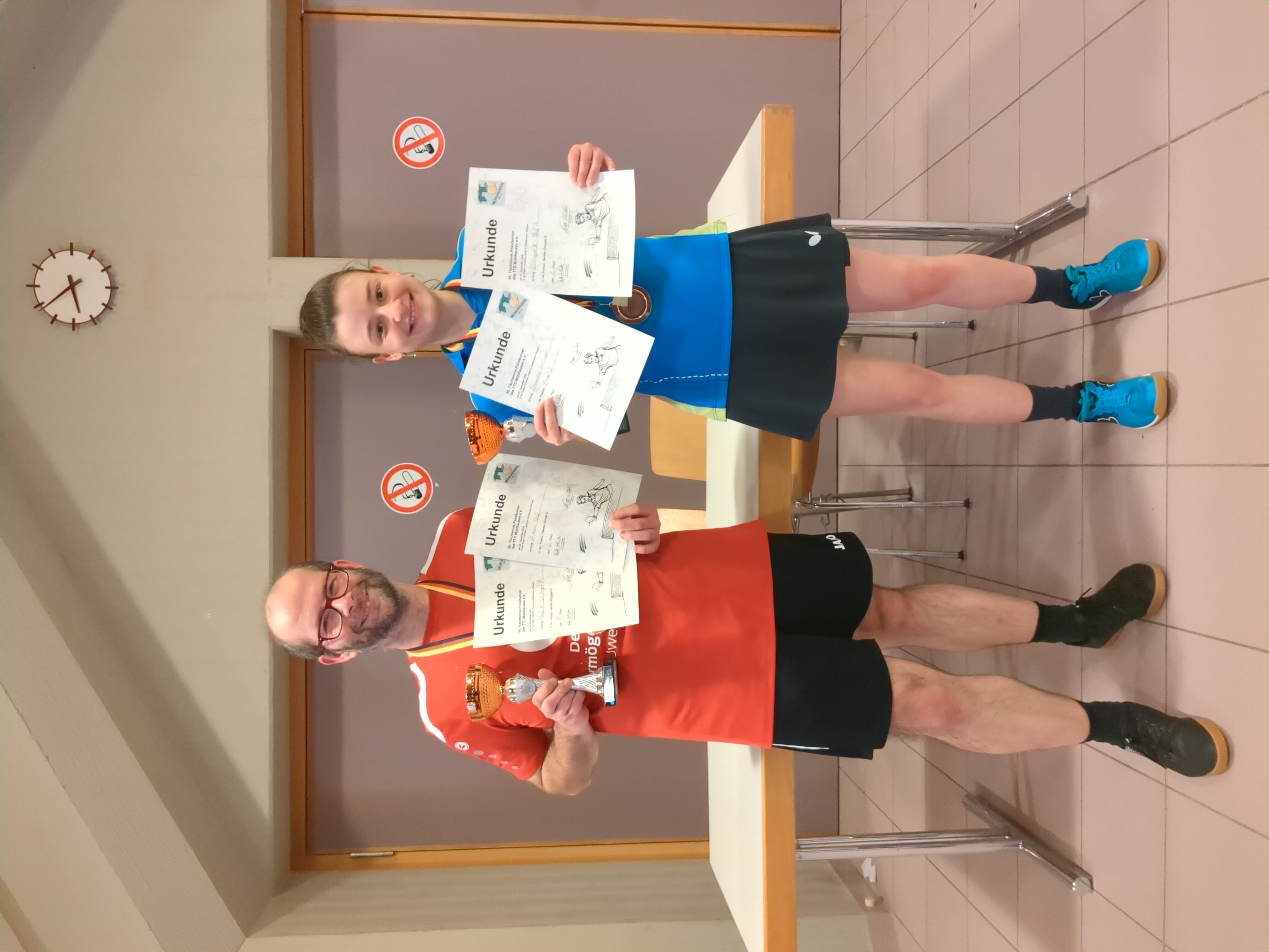 Der Erwachsenen D-Wettbewerb, der bis zu einem QTTR-Wert von 1.350 Punkten ausgeschrieben war, war dabei komplett in Ulmer Hand. Alexandra Schillinger, die in dieser Konkurrenz nur aufgrund der ausgefallenen Damenklasse antrat, und Andreas Pfaff harmonierten hier zunächst im Doppel hervorragend und konnten doch recht unerwartet das oberste Treppchen des Siegerpodests erklimmen. Doch dies sollte nicht ihr einziger Coup bleiben. Im Einzel ließen sie nämlich ebenfalls das gesamte Feld hinter sich. Alexandra, die sich nach ihrer Niederlage im ersten Vorrundenspiel am frühen Morgen erheblich steigern konnte, setzte sich schließlich im Finale in drei Sätzen gegen ihren Doppelpartner Andreas, der sich aber trotzdem wie sie über den hervorragend gelaufenen Turniertag inklusive Pokal- und Medaillengewinn riesig freute, durch. Auch Peter Schillinger musste die Heimreise nicht ohne Erfolgserlebnisse antreten. Er belegte nach zahlreichen intensiven Duellen und relativ knappen Niederlagen im Endspiel bzw. im Halbfinale bei den Senioren 50 den zweiten und im Erwachsenen B-Wettbewerb (QTTR-Wert maximal 1.700 Punkte) den dritten Platz. Mitten in der Nacht, nachdem man etwa 18 Stunden in der Halle verbracht hatte, wurde die lange Rückfahrt bei teilweise sehr dichtem Nebel letztendlich ebenso noch erfolgreich gemeistert.